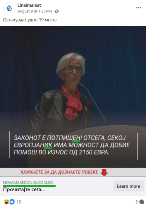 Инаку, објавата што ја рецензиравме е објавена на една Фејсбук-страница, која е подеднакво сомнителна, а нејзиниот назив е Linaimaleat. Таа има само грст следбеници и само две објави. Земајќи го предвид сето досега наведено, објавата ја оценуваме како невистинита.