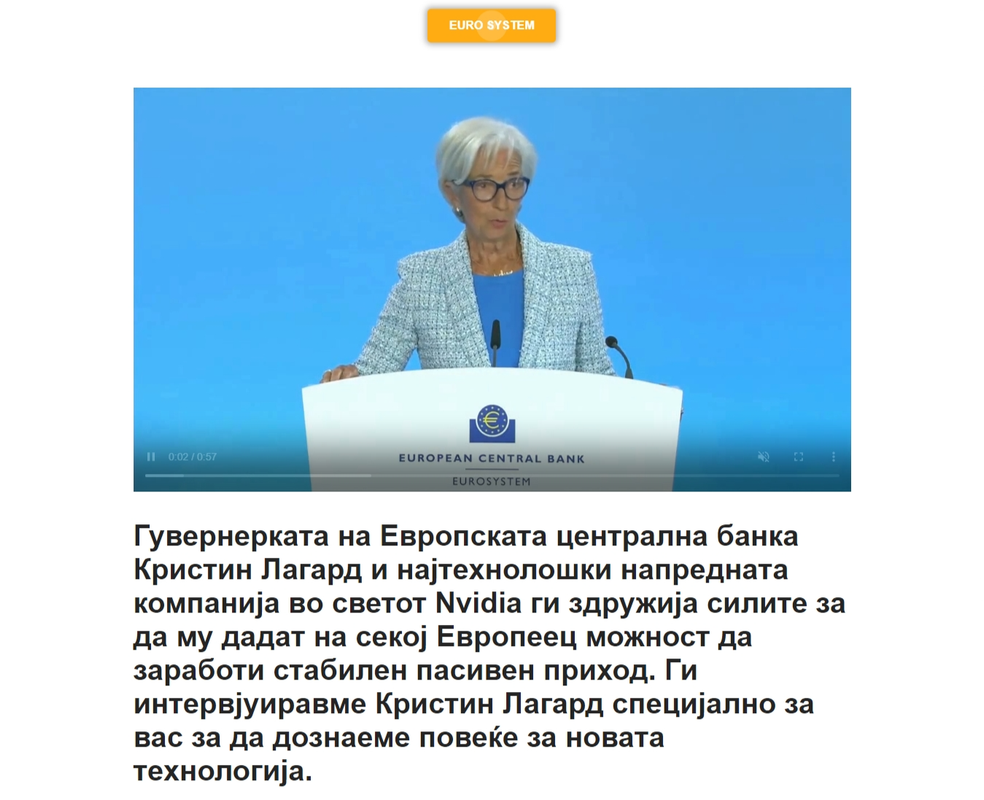 На веб-страницата, на која бевме доведени со измама, има клип, во кој претседателката на Европската централна банка, Кристин Лагард, нè кани да инвестираме во некаков проект реализиран во соработка со американската компанија за компјутерски хардвер Енвидија, но за тој проект ние не најдовме ништо на интернет. Дури и проектот да постои, таа сомнителна веб-страница не е местото кајшто би требало да инвестираме во него.