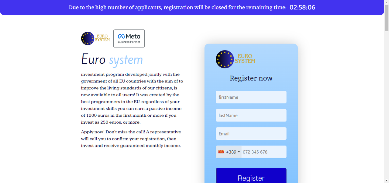 На крај кликнавме на копче со натпис „Инвестирај во Euro System“, а тоа нè одведе до еден формулар за регистрација, кајшто е злоупотребено името на американската компанија Мета (позната како сопственичка на Фејсбук). Таа во случајов е лажно претставена како бизнис партнер на оваа „инвестициона платформа“ (скриншот тука).